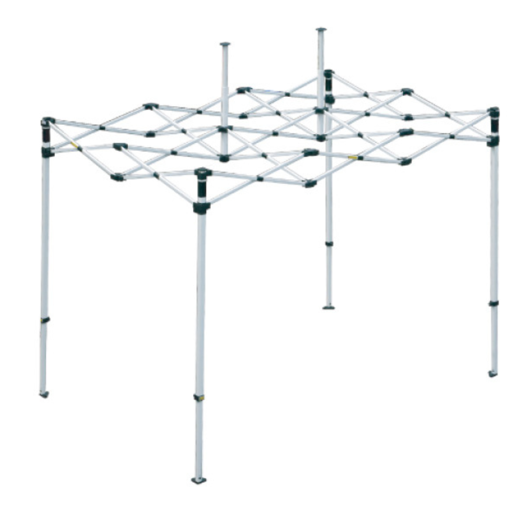全てのフレームパーツに高強度アルミを採用。「驚くほどの軽さ」を実現し、女性や少人数での設営・運搬が容易です。また、鉄を含まないため錆(サビ)に強く、海沿いのイベントや湿気の多い場所での長期保管にも適しています。