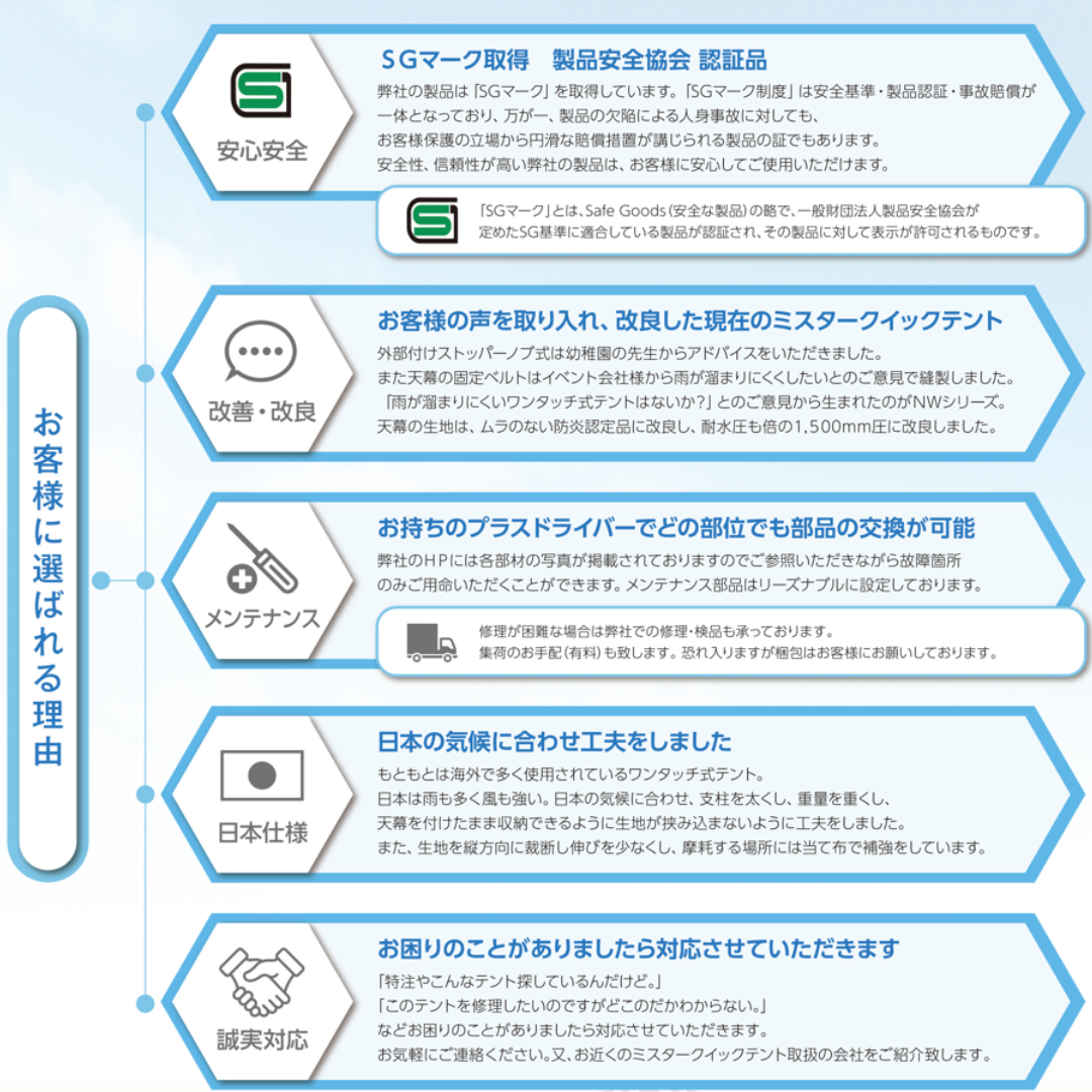 イベントや学校行事、防災用として多くの導入実績を誇る理由は、確かな安全性にあります。ミスタークイックは、厳しい安全基準をクリアした製品のみに与えられる**「SGマーク(Safe Goods)」を取得。万が一の製品欠陥による事故に対応する賠償措置も講じられており、企業様や自治体様、教育機関様にも「最も信頼できるテント」**として選ばれています。日本のクイックテントの中では唯一取得しております。